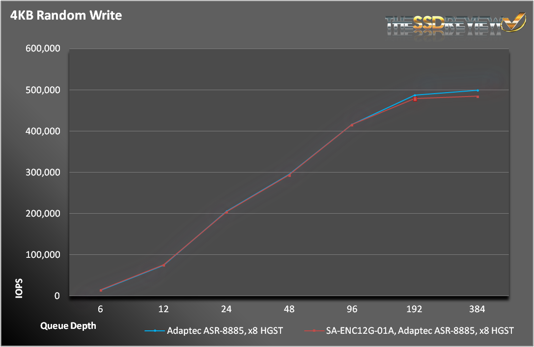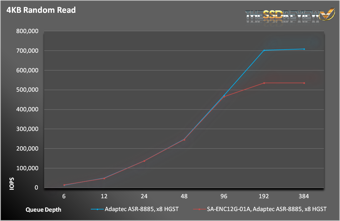 Overall, the convenience of using the SA-ENC12G-01A completely outweighed the minimal performance hit. We do wish that we would have been able to hit the 700K read IOPS that we had previously achieved.