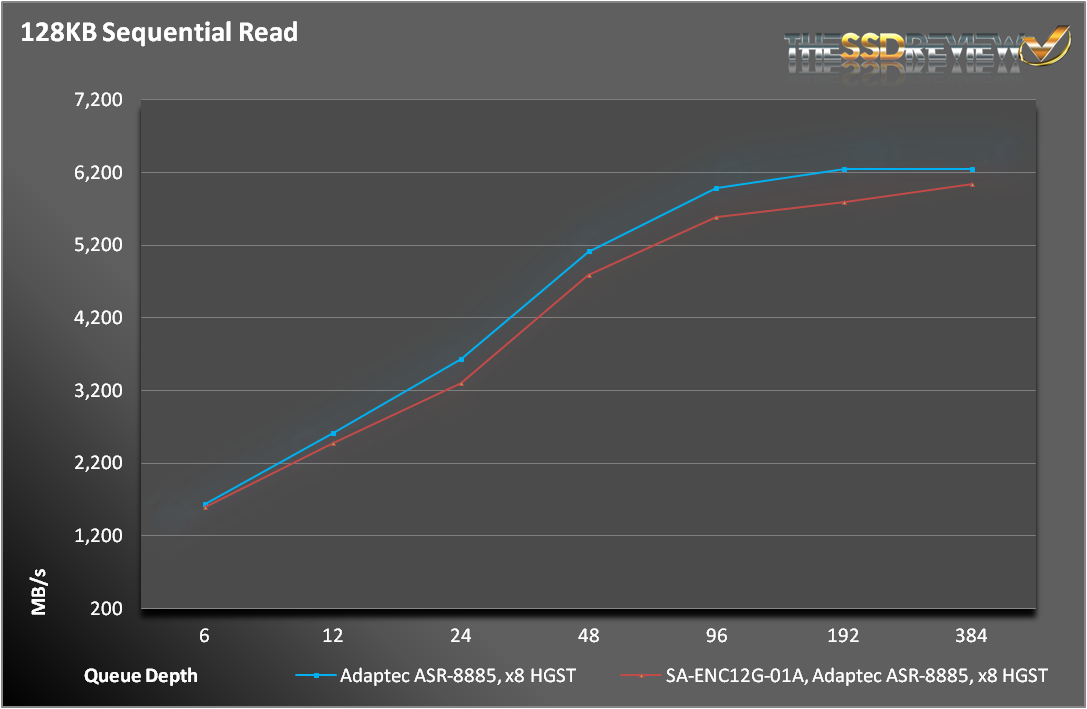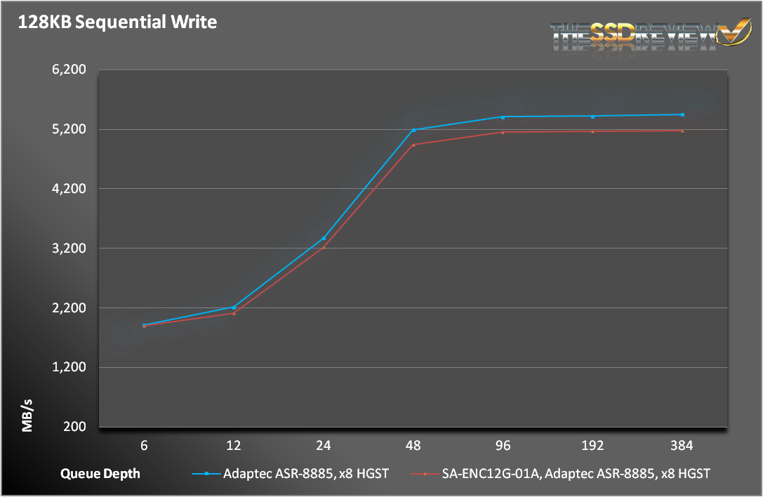 When testing the SA-ENC12G-01A, we actually have a concrete set of data that we are trying to match. Our test setup is almost identical to our Adaptec ASR-8885 review. The only difference is the SA-ENC12G-01A. In an ideal world, the results would be identical, but with additional connectors and backplanes, we expect at least a slight dip in performance.
