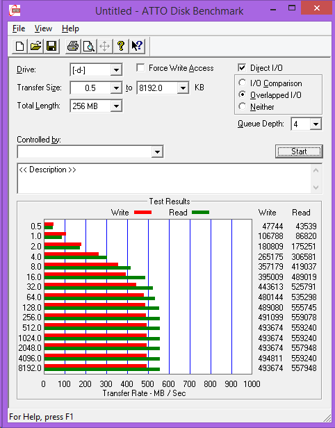 ATTO reveals some strong small file size performance. Sequential reads reached a high of 559MB/s as well as a high of 494MB/s for write. These numbers are much better than the rated spec!