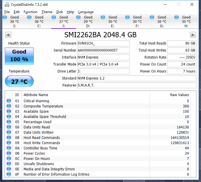 Crystal Disk Info is a great tool for displaying the characteristics and health of storage devices. It displays everything from temperatures, the number of hours the device has been powered, and even to the extent of informing you of the firmware of the device.
