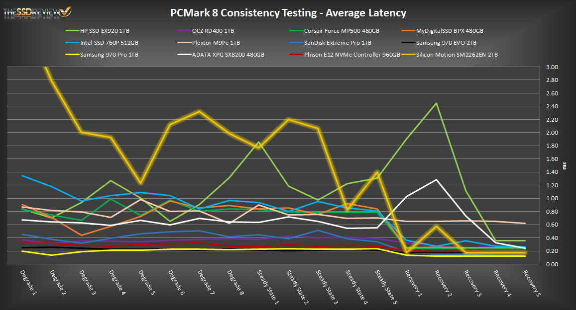 Similar to the HP EX920, the MSI SM2262EN controller shows high latency in comparison to the other SSDs. Under heavy use, it shows the worst latency results. However, once it gets into the recovery phases, it catches back up and is third overall. From this, we can see there are still some optimizations to be done to improve its performance.