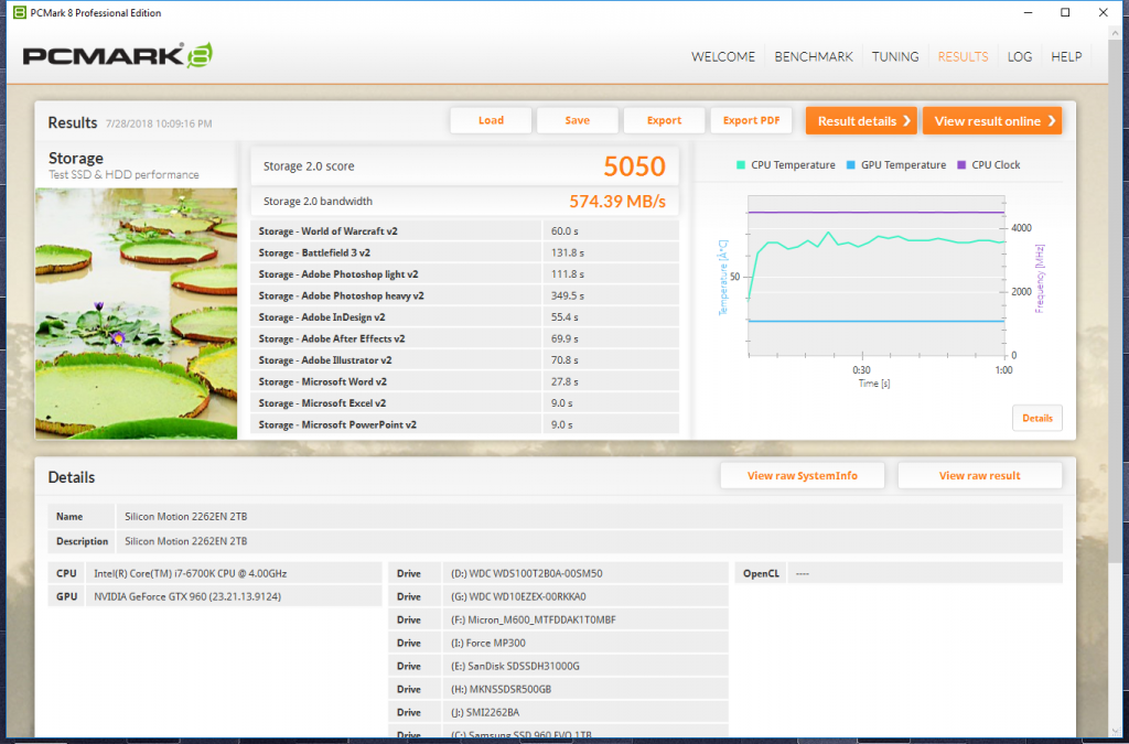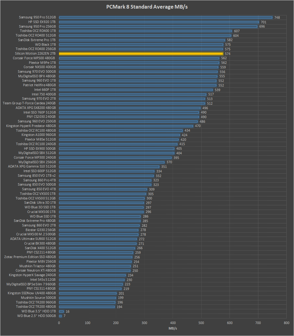 SMI’s SM2262EN achieved an overall score of 5050 points and averaged 574MB/s in PCMark 8.