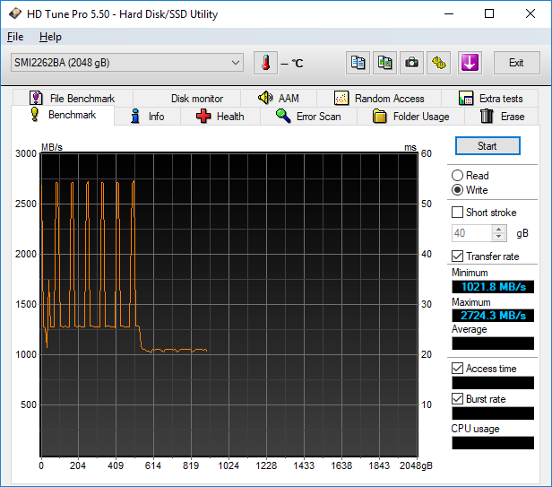 HD Tune is a Hard Disk Utility with many functions from error checking, health testing (S.M.A.R.T.), and of course benchmarking. To build upon our real world write test we also looked to see where the write speeds leveled off to by using HD Tune Pro. If SLC caching is being utilized, this test will typically show it.