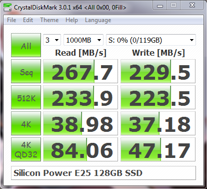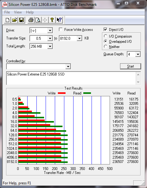 ATTO scores are about what we should expect from a SATA 2.0 drive of this calibre. The specifications noted by Silicon Power indicate that the drive should saturate full SATA 2.0 read speeds (roughly 275mb/s) which are achieved, but a write speed of 240MB/s is decent at best.