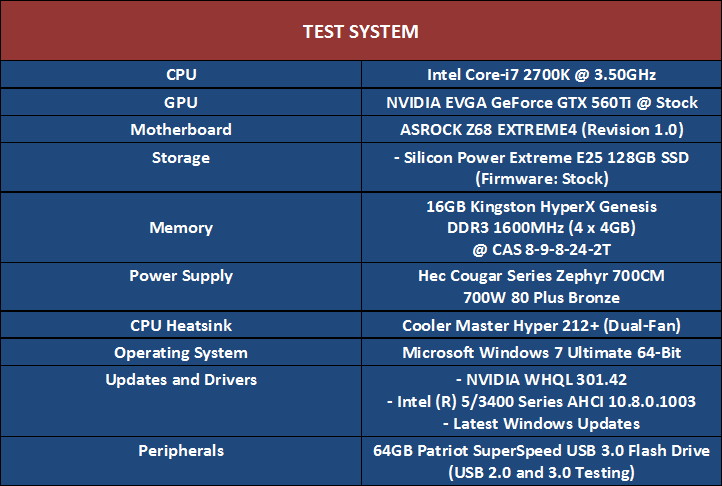 Since the Silicon Power E25 is a SATA 2.0 device, native Intel ports were used on the ASROCK Z68 EXTREME4 motherboard, with updated Intel RST drives of 10.8.0.1003. In addition, only stock firmware was available for the 128GB Silicon Power Extreme E25 SSD.