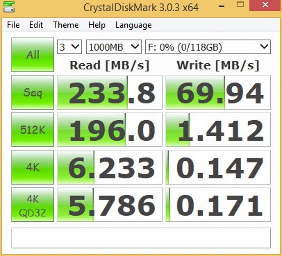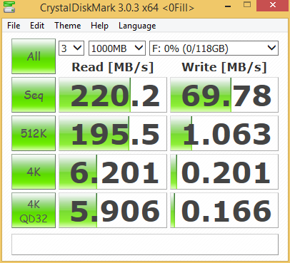 With Crystal Disk Mark we see that using 0Fill data the read speed reaches 220 MB/s and the write speed reaches 69 MB/s. When we switch over to random data, we see an interesting, but slight, jump in read speed to 233 MB/s, where as the write speed stays the same.