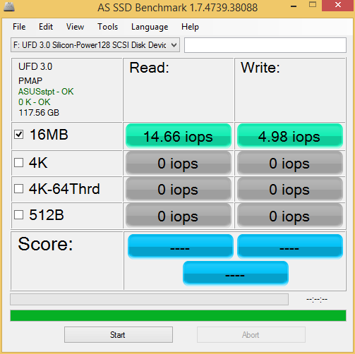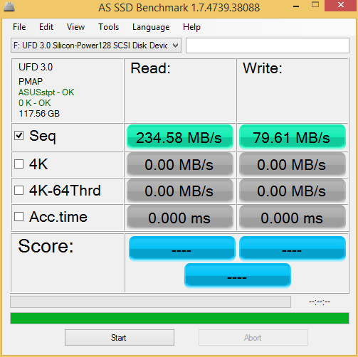 In AS SSD, we see that the Marvel M70 reaches 234 MB/s with read speeds and 79 MB/s with write speeds. When taking a look at the IOPS, the Marvel M70 comes back with 14 and 4 IOPS, respectively.