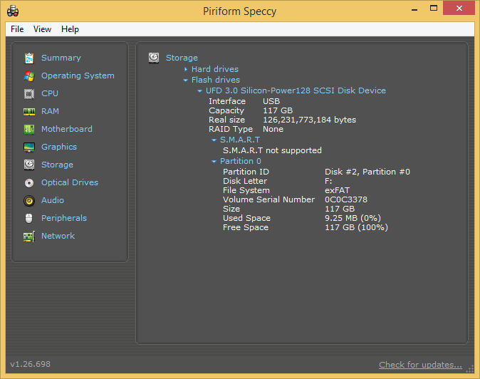 With Speccy we can see that the Silicon Power Marvel M70 has a usable capacity of 117 GB, with a real size of 126 GB, further that this drive is also formatted in exFAT.