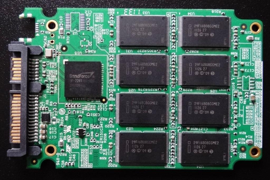 Once disassembled, the inside of the SSD consists of a green printed circuit board (PCB) which contains the SandForce SF-2281 processor and 16 chips of NAND flash memory. Silicon Power was wise to (this time) go with Intel 25nm synchronous NAND flash memory, each piece being 16GB in capacity for a total of 256GB RAW capacity.