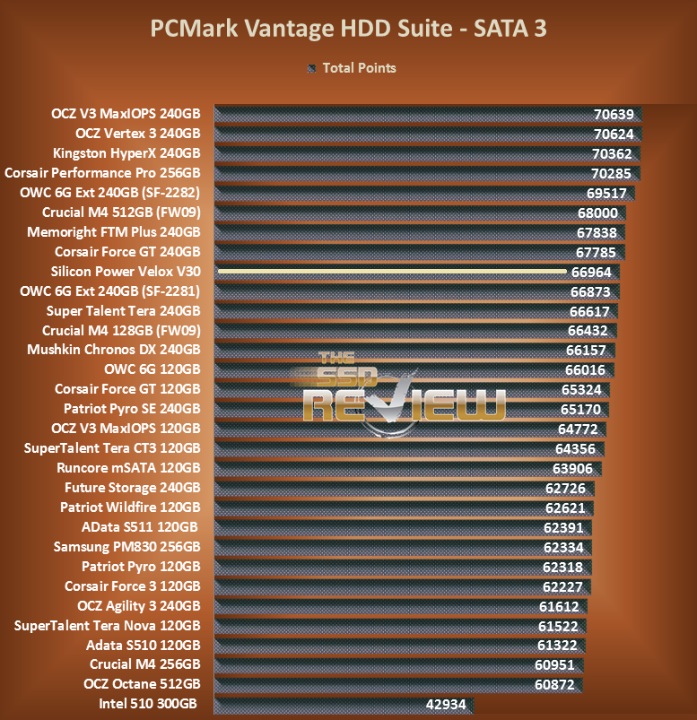 The Velox sailed through Vantage testing with 66964 total points and a high transfer speed of 407MB/s when using Media Player. That is definitely SATA 3 speed! In examining all tests conducted of ‘new gen’ SATA 3 drives tested by us this year, this places the Velox just above the OWC 6G SSD and just below the Corsair Force GT SSD, both as well being 240GB SSDs with the same SandForce processor. Let’s take a closer look at the Vantage result and some of the test transfer speed results: