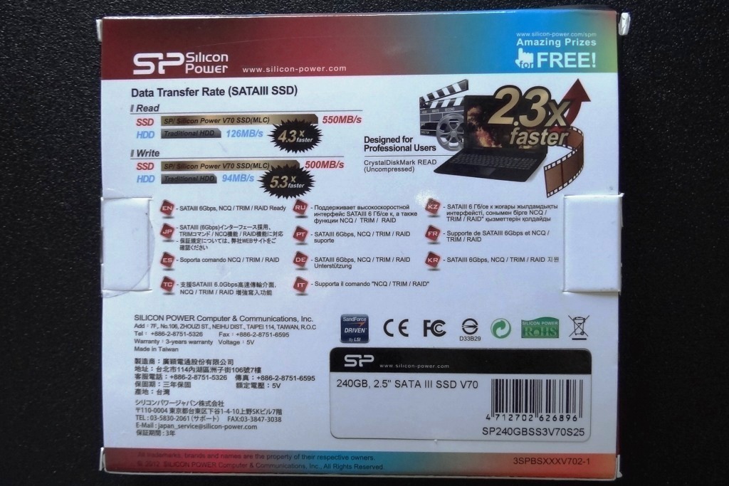 Performance for the V70 is typical LSI SandForce Driven speeds with specifications of 557MB/s read and 507MB/s write with 86,000 IOPS at 4k aligned random write disk access. We give full marks to SP for their exterior packaging as it not only promotes the Velox V70, but also, does a nice hard drive to SSD comparison which is a key element to consumer sales. The V70 comes with a desktop adapter and standard three year warranty.