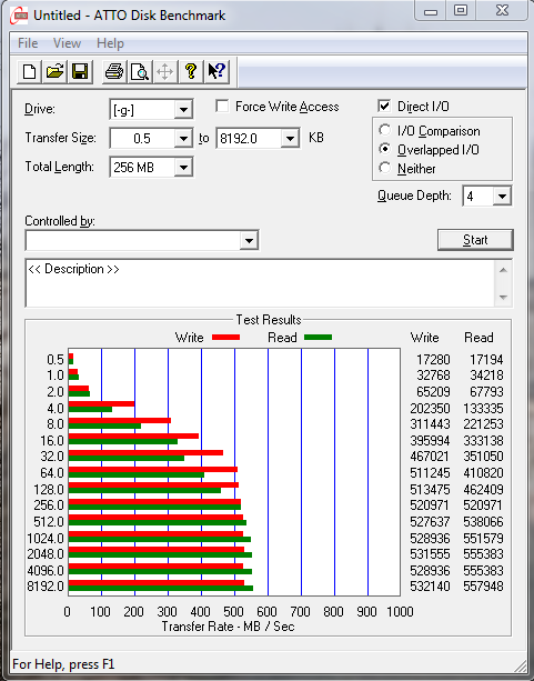 Initial ATTO results of 557MB/s read and 532MB/s write are excellent and typical of most ‘LSI SandForce Driven’ SSDs.