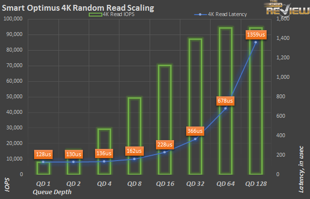 4K read scaling looks good, peaking at 95K IOPS at a queue depth of 64. Average latency — the latency of each IO averaged throughout the test — remains minimal until reads stop scaling past 64 outstanding commands. At QD64, average latency is still only .687ms.
