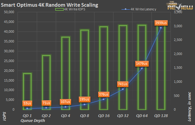 4K write scaling looks similar to the 128K scaling. That is, it peaks at relatively low queue depths. Latency is superb across the board, starting with .053ms at QD 1 (a scant 53 microseconds) and staying low until the writes stop scaling with QD when more than 32 commands are in the hopper. At a queue depth of 32, the Optimus pulls down 44K IOPS at an average latency of .741ms. Later, we’ll take a more in depth look at some write characteristics using a QD of 32.