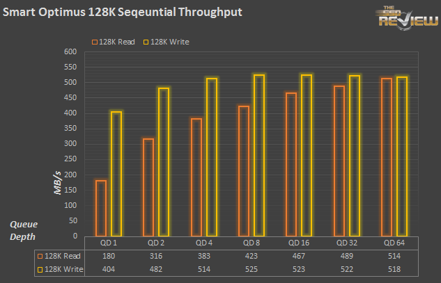 Throughput testing is the most basic kind of performance evaluation. After the requisite preconditioning on a freshly secure erased drive, we see that SMART wasn’t wrong about their 500MB/s read and write claims. Reads scale progressively from QD1 to QD64, from 180MB/s to 514MB/s. Writes are another story, hitting over 500MB/s at QD4 and peaking at 525MB/s. We’re constrained by the limitations of the 6gbps interface, but sequential performance is not the bread and butter of the Optimus.