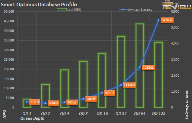 The database profile is just 8K transfers, but 67% of the operations are reads. If we go back to the SNIA IOPS testing, the 65/35 8K performance is extremely close to what we see here. We get to see the scaling with queue depth here though, and that’s important too.