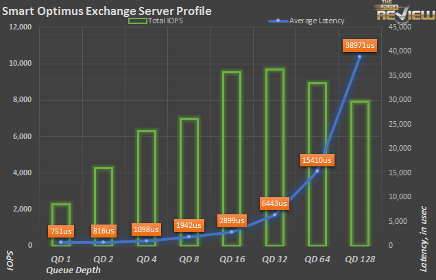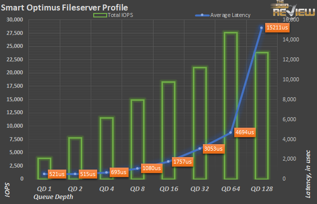 The fileserver profile is an 80% read 20% write mix. It’s made up of blocksizes from 512 to 64K, each making up a different percentage of the access pattern. The pattern is: 512 bytes=10%, 1k=5%,2k=5%, 4k=60%, 8k=2%, 16k=4%, 32k=4%, 64k=10%. The Optimus hits over 27,500 IOPS at a QD of 64. From the previous tests, we know that reads scale more with queue depth, and the fileserver pattern is 80% reads.