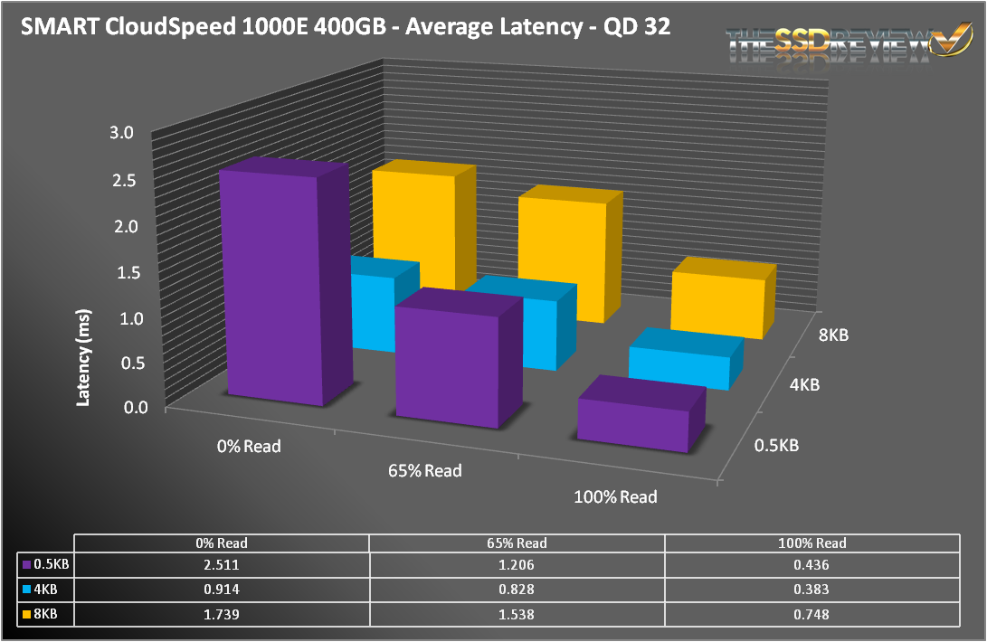 To specifically measure latency, we use a series of 512b, 4K, and 8K measurements. At each block size, latency is measured for 100% read, 65% read/35% write, and 100% write/0% read mixes.