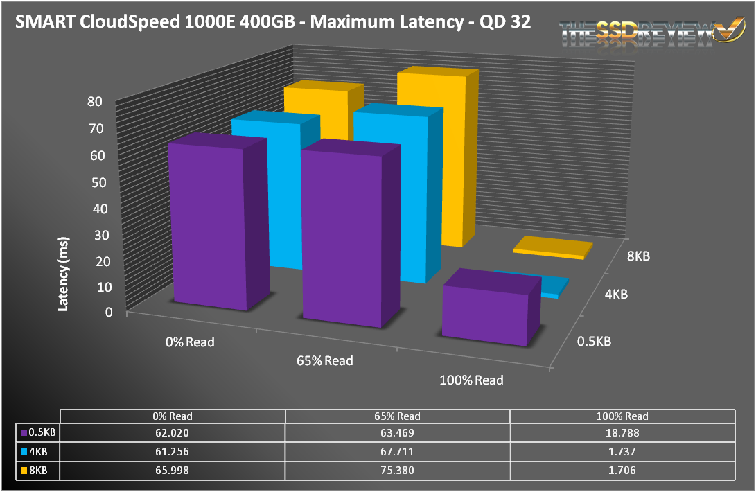 As we looked at maximum latency, we were a little surprised at the results. Maximum latency, when any write operations were involved, was always 60-70ms. This is quite a bit higher than the competition, where we are use to seeing 10-20ms maximums. Once we moved into 100% read operations at 4 and 8KB, the number dropped to under 2ms, which is class leading.