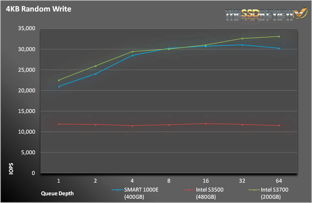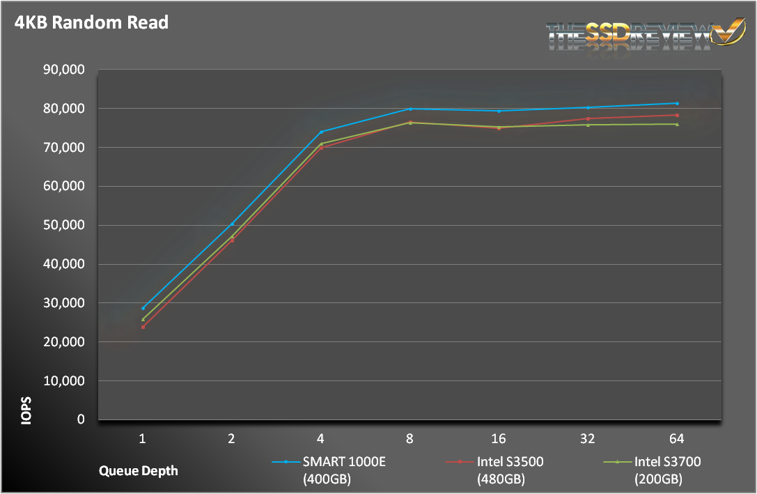 Up until this point, the 1000E and the S3500 have put up comparable numbers. Random 4KB operations is where the 1000E pushes itself into the same class as the Intel S3700. With 30k IOPS available, the 1000E stays right with the S3700 across all queue depths, easily blowing the S3500 out of the water. The 1000E also takes the crown with random reads, with a slight edge over the Intel SSDs.