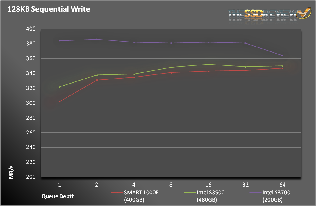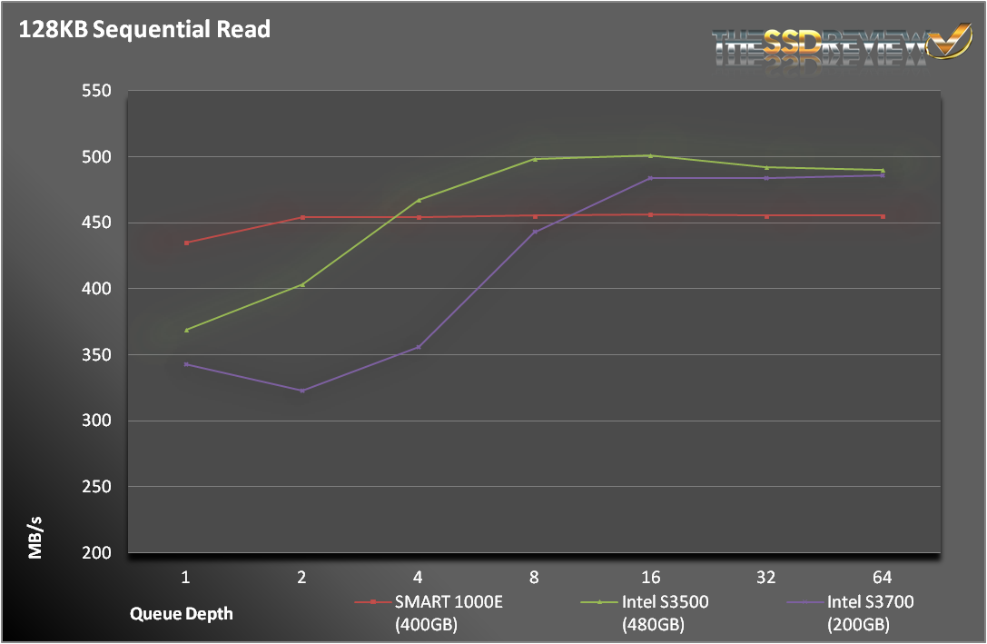 Sequential operations were an area we were concerned about, especially when compared to the Intel SSDs. For write operations, the 1000E held its own against the more aggressively specified S3500. Read operations lined up well with the spec sheet, with the 1000E easily hitting 450MB/s. One thing that we noticed throughout our testing is that the 1000E did really well at low queue depths. At queue depths of 1 and 2, the 1000E bested the Intel SSDs by a solid margin.