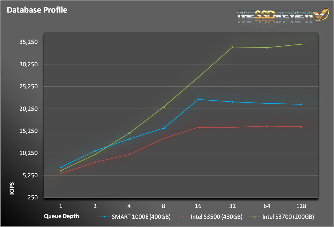 For our database profile, the 1000E slipped right in between the Intel SSDs. The extra random write performance was more than enough to out-pace the S3500. The 1000E also continued its trend of excellent performance at low queue depths, where it beat out the S3700.