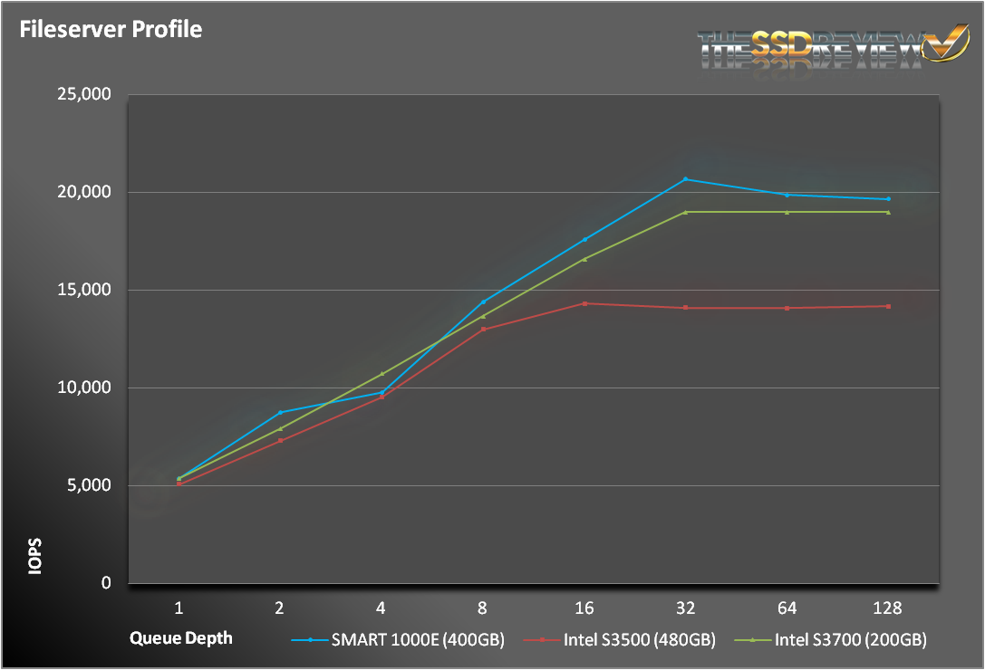 At lower queue depths, all 3 drives performed equally well in our fileserver profile. The 1000E and S3700 pulled away at higher queue depths. Overall, the 1000E gets the nod on 7 of the 8 queue depths we tested.