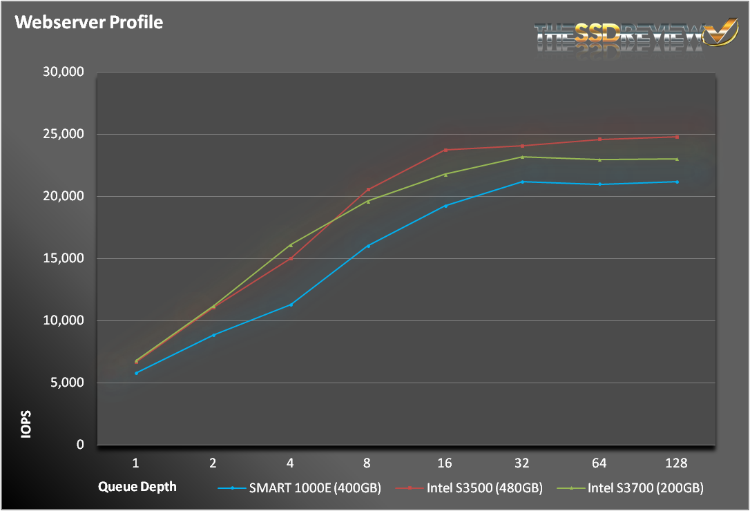 The tables are turned for our webserver profile. Both Intel drives hold a 10% advantage across all queue depths.