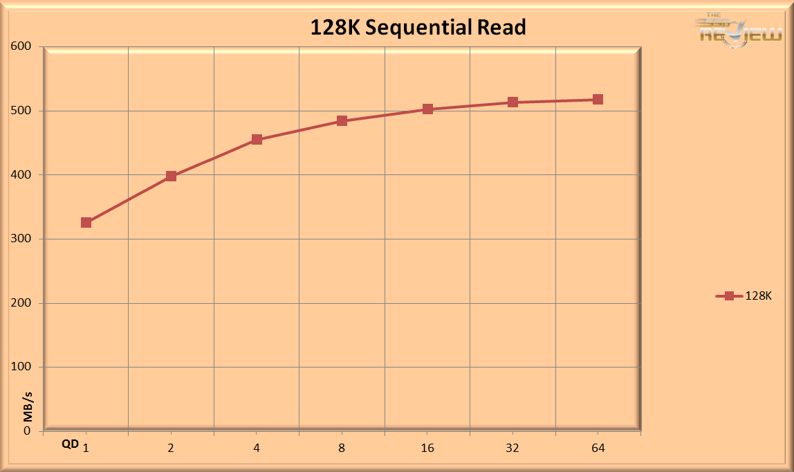 To round off our read performance measurements, by far the quickest and easiest of all of our testing, we turn to the 128K Sequential Read tests. This test shows the maximum read throughput at a realistic file size that the SSD would encounter in enterprise usage. At a QD of 64 the read speed tops out at 517 MB/s.