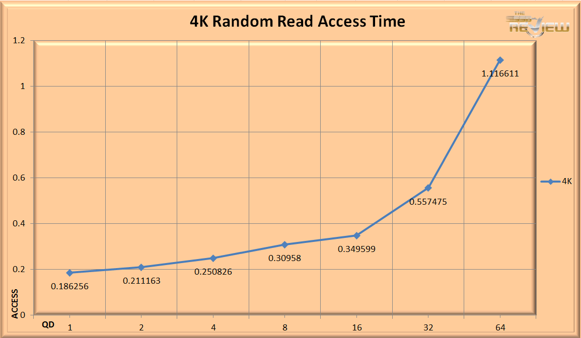 The 4k Read Latency is a very important measurement, as it shows the overall responsiveness of the SSD under varying Queue Depths (QD). At the QD of 1, the 4k random access time comes in at .186, which is a very good latency measurement. Clicking the graphs will bring them to full size.