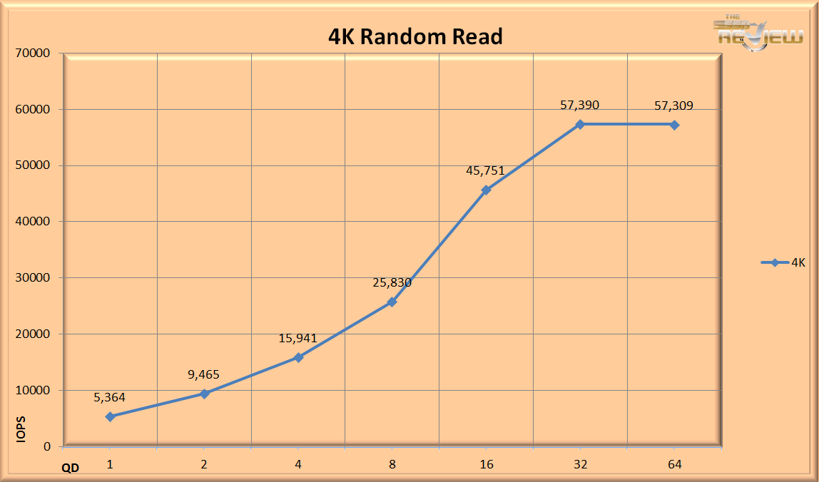 The 4K Random read measurements are one of the most-sought after measurements when making an analysis of drive performance. Indicative of the overall speed and agility of the SSD at random access, they are the litmus test for one of the key advantages that SSDs possess. We test with a five second ramp-time for all measurements that we provide for all benchmarks, for the purposes of eliminating “bursty” results.