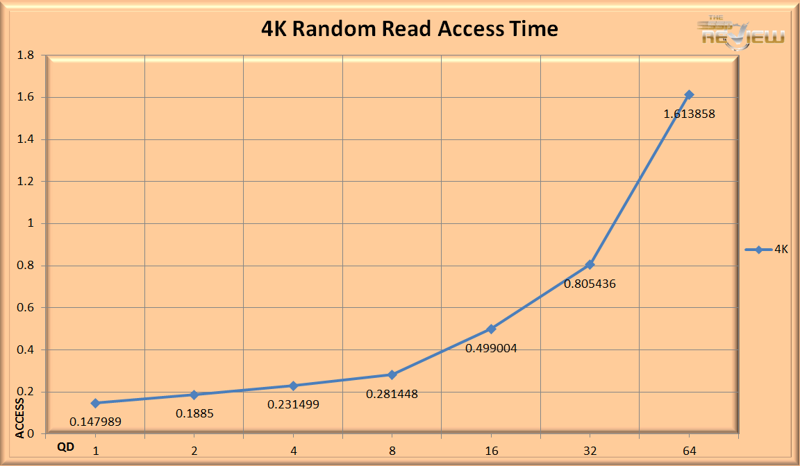 The 4K Random read measurements are one of the most-sought after measurements when making an analysis of drive performance. Indicative of the overall speed and agility of the SSD at random access, they are the litmus test for one of the key advantages that SSDs possess. We test with a five second ramp-time for all measurements that we provide for all benchmarks, for the purposes of eliminating bursty results.