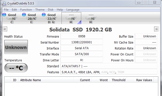 Crystal Disk Info provides some excellent information about the SSD itself to include its health, product information, power on information as well as the characteristics of the SSD. As much as many think very little can be learned from this result with absolutely no SMART data available, the fact that TRIM was not highlighted became very obvious.