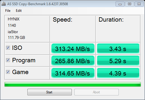 In AS SSD, we get a better look at testing with incompressible data, and also, a first look at IOPS performance. Once again, we can see that the initial specifications were rather conservative as 56425 IOPS exceeds specs. Another very nice indicator of performance was the AS SSD Copy Bench result: