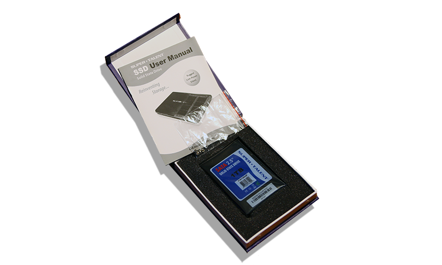 Exterior packaging is of a hard board exterior where the top simply lifts up from its magnetic seal on the bottom front. This is typical Super Talent and I don’t think we have ever seen a different container for any of their products; our reviews tracing back several years.