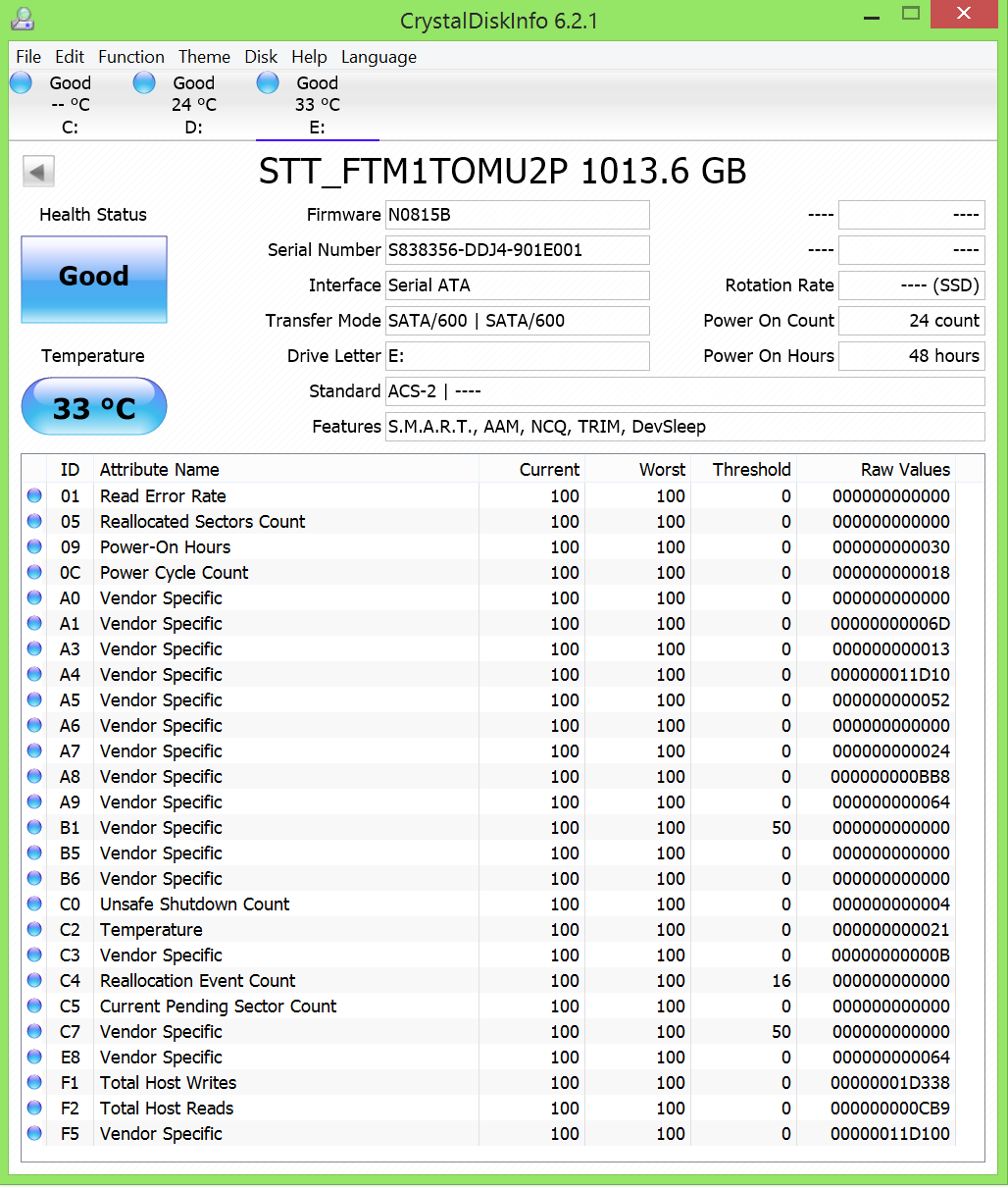 Crystal Disk Info is a great tool for displaying the characteristics and health of storage devices. It displays everything from temperatures, to the number of hours the device has been powered, and even to the extent of informing you of the firmware of the device.