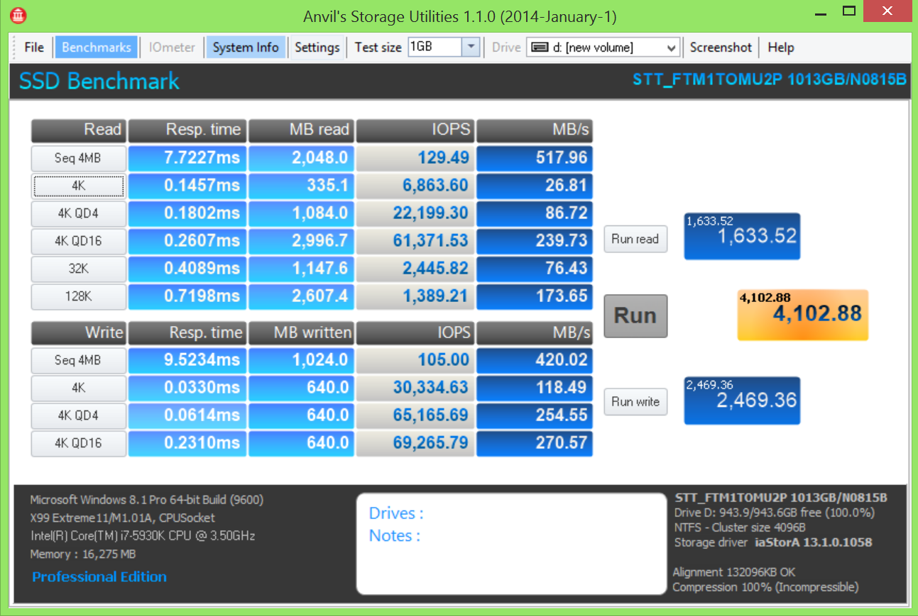 Anvil’s Storage Utilities (ASU) are the most complete test bed available for the solid state drive today. The benchmark displays test results for, not only throughput but also, IOPS and Disk Access Times. Not only does it have a preset SSD benchmark, but also, it has included such things as endurance testing and threaded I/O read, write and mixed tests, all of which are very simple to understand and use in our benchmark testing.