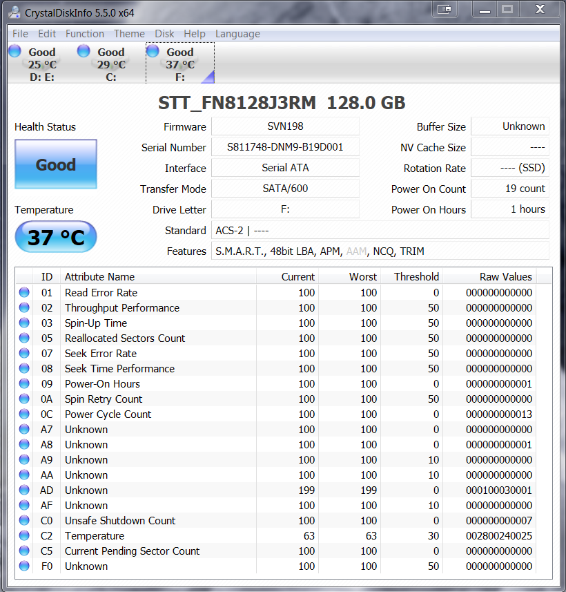 Crystal Disk Info provides some excellent information about the SSD itself to include its health, product information, ‘power on’ information as well as the characteristics of the SSD. We can see that the SSD is capable of TRIM as it is not grayed out as with AAM.