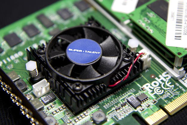 The first thing you notice, beyond the large Super Talent cover plate, is the heatsink with the recessed fan. This cooling solution is for the LSI 2108 and is almost identical to the one used on the Areca ARC-1880. While the LSI 9265-8i does not use a fan on its heatsink, we tend to like the fan because it keeps the RoC cool in systems with non-optimal cooling, but it does introduce another point of failure. This probably isn’t a huge point of concern considering the device’s 1.5M hr MTBF.