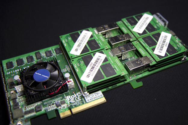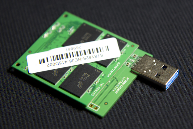 After removing the metal cover, we can now see the 8 SSD modules. The first thing that jumps out is that each SSD module is connected via…USB? That can’t be right, can it? Don’t worry, this isn’t just a large USB drive with a hub. Those modules are connected via SATA, but Super Talent is using USB 3.0 connectors to reduce cost, simplify the design and to make it more modular.