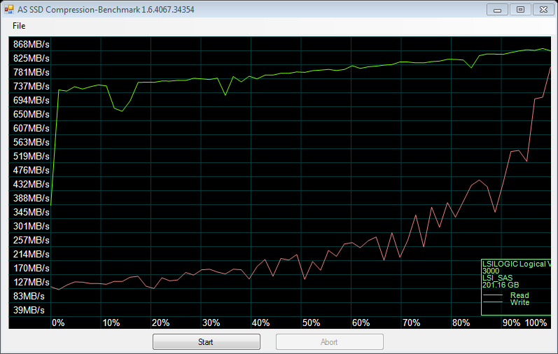 The Compression Benchmark is typical of what we see with SandForce drives where they start low and then peak much higher and in the range somewhat in the area of specifications, remembering again that this drive was simply ripped out of Super Talents display test bench at CeBIT.