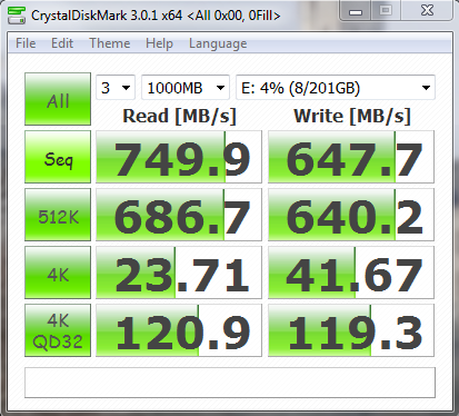 Crystal Disk Benchmark is used to measure read and write performance through sampling of raw (0/1 Fill/compressible) or random data which is, for the most part, incompressible. Many new SandForce Driven SSD owners who cant wait to test the performance of their SSD often grab this program and run a quick test, not realizing that they are testing with incompressible data rather than compressible data used in testing by manufacturers. We have provided compressible (oFill) results on the left with incompressible (random data) results on the right.