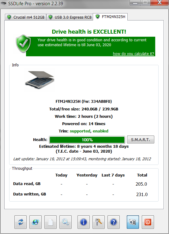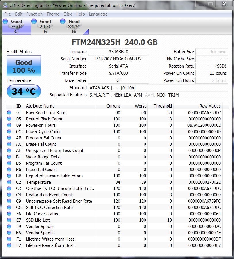 A few of the things CDI tells us are that we are using the latest premium SandForce firmware release, TRIM is functioning as well as the fact that this drive has only been powered on thirteen times for a total of two hours use. Here is another view as seen through SSDLife Pro. :