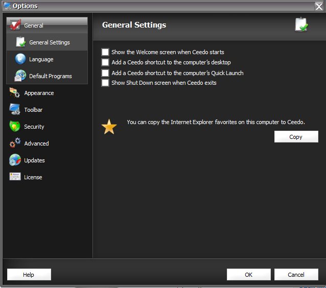 ‘General Settings’ allow you to establish exactly how you want the software to act when the program is started on a system while the ‘Appearance’ menu allows you to select from preset themes, colors, as well as personalization to include a nickname and picture. ‘Toolbar’ settings include the ability to migrate the computers desktop shortcuts and description into Ceedo automatically along with your choice of icon size and the ability to hide the Ceedo tab when not in use.