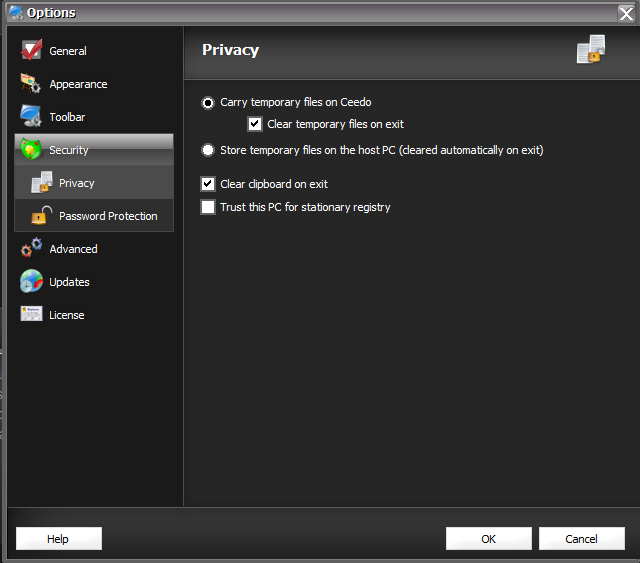Ceedo’s ‘Security’ options allow us to carry temporary files and clipboard contents on the Ceedo drive or clear them on exit and we also have the option to store the temporary files on a host PC and also to trust the computers stationary registry.