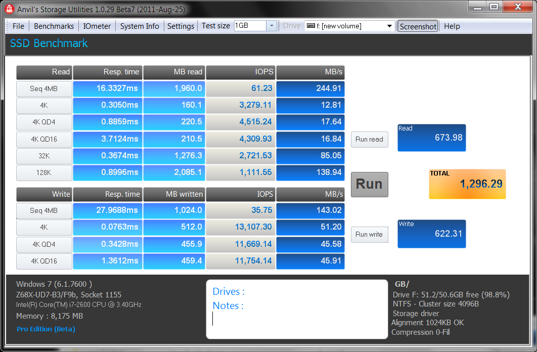 Anvil Pro provides us with a bit more information by displaying response times, MB read as well as a look at total IOPS. The high sequential result of 244MB/s was as expected and, once again, a nice high score in the 4k random writes of 51MB/s is very encouraging.