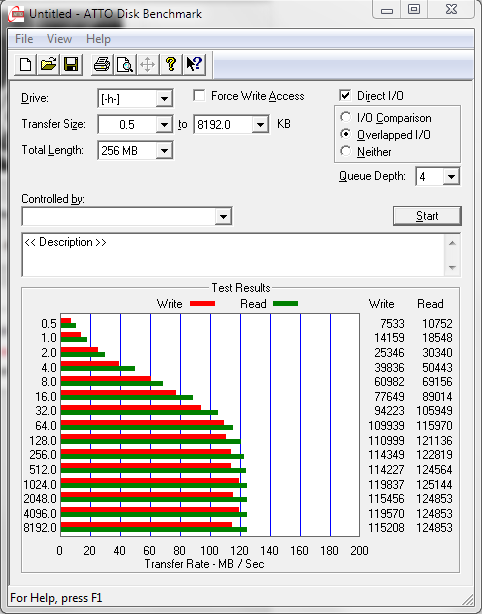 Initial ATTO benchmark results are very encouraging as they surpass listed specifications of 100MB/s read and 90MB/s write transfer speed performance.