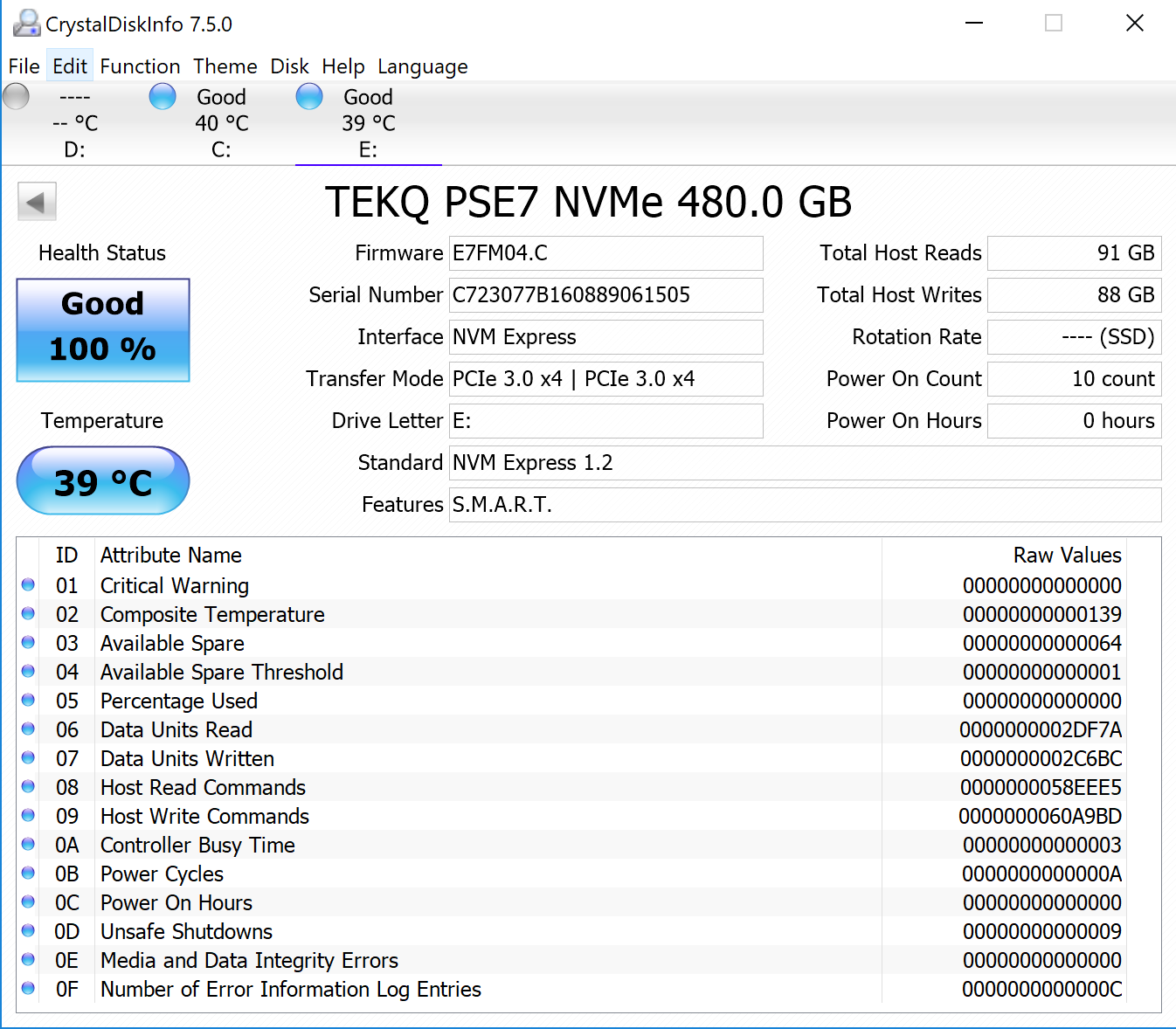 The two biggest takeaways from this Crystal Disk Info report are confirmation that this Tekq Rapide external SSD is operating on PCIe 3.0 x 4 (4 lanes), and also, that it uses the NVM Express 1.2 protocol.