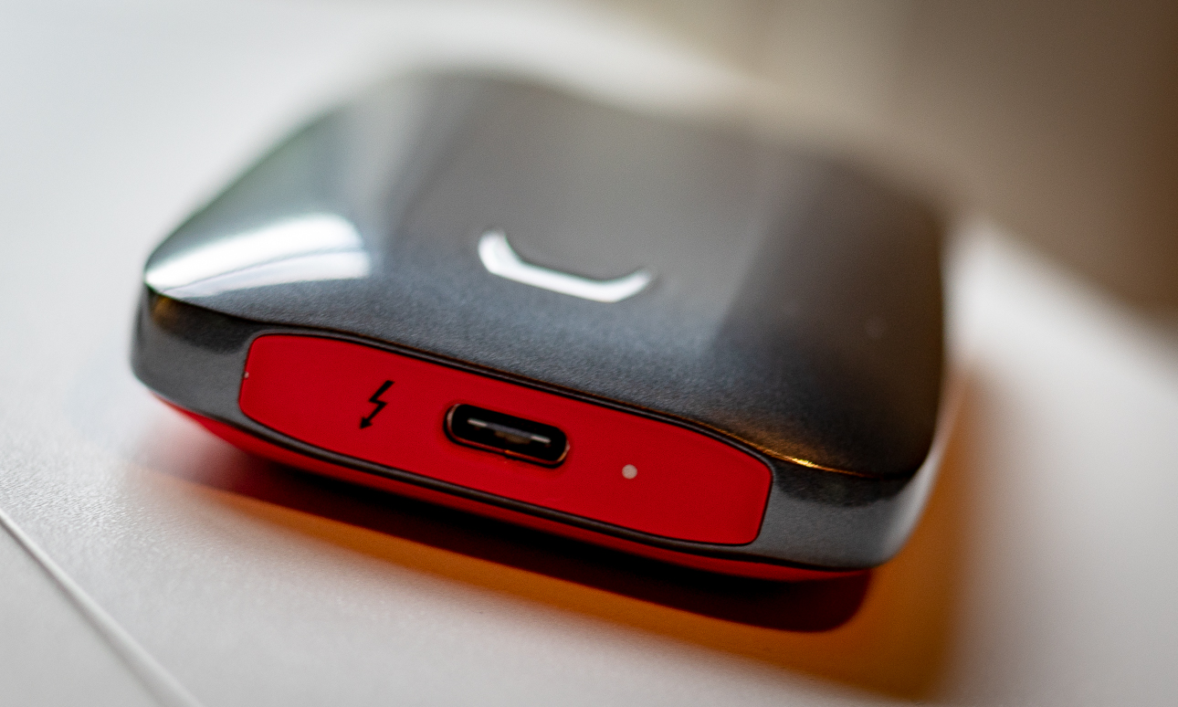 The top of the Samsung X5 has a very attractive glossy grey plastic casing which switches over to a red soft rubber over plastic casing for the bottom. This portable SSD is bus powered so no power cable is necessary; one uses only the data cable for power and data transfer.