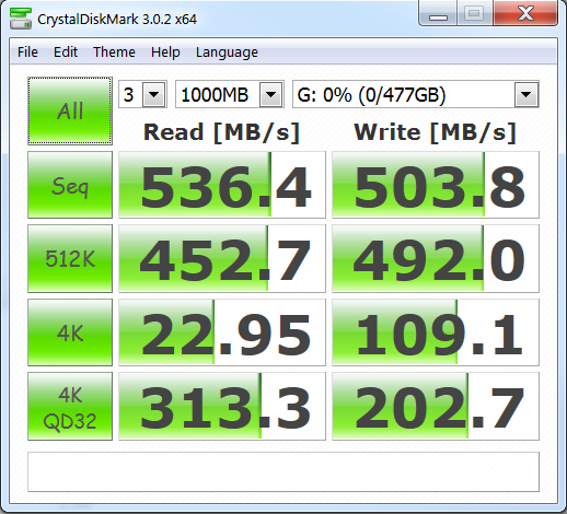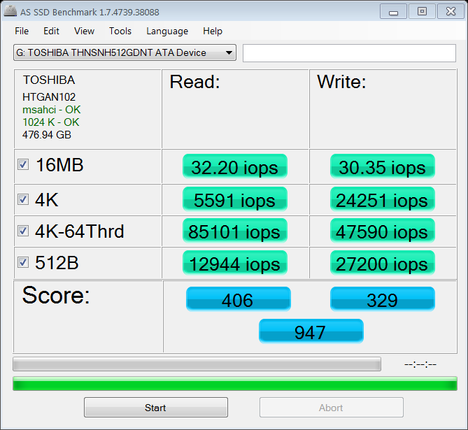 AS SSD provides a first look at 4K IOPS and, while 85101 IOPS is just below the listed spec of 90K. 47590 low 4K write IOPS are well above the listed 35K. Decent SATA 3 results were also seen in the AS SSD Copy Bench result: